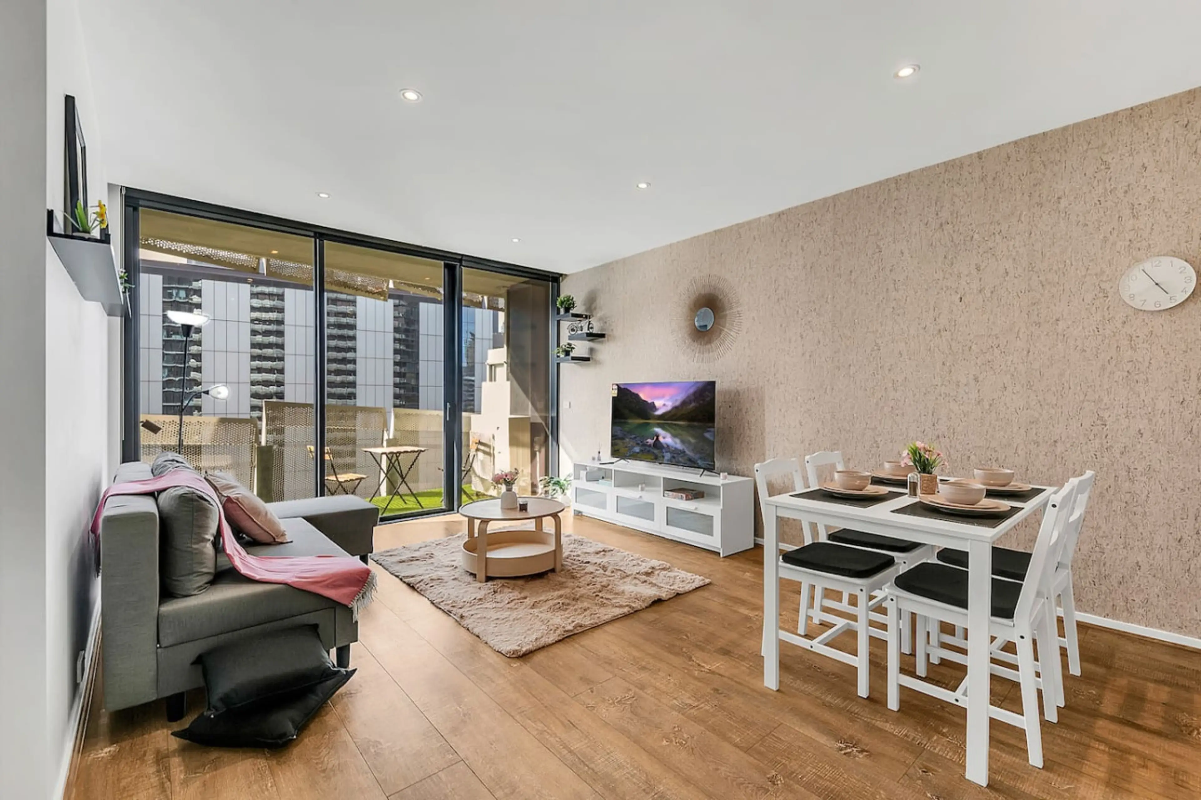 Welcome to your modern Docklands escape! This spacious two-bedroom apartment features a fully equipped kitchen, perfect for preparing home-cooked meals. Enjoy the convenience of free onsite parking, plus access to a sparkling indoor pool, state-of-the-art gym, rejuvenating sauna, and a stunning sky...
